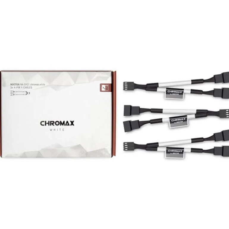 El NA-SYC1 chromax.white es un conjunto de accesorios de ventilador compuesto por tres cables NA-YC1 con forma de Y que posibilitan el funcionamiento de dos ventiladores PWM de 4 pines con un único conector y que permiten que la placa base controle la velocidad de ambos ventiladores de manera simultánea. Puede conectar en serie varios NA-YC1 para controlar más de dos ventiladores PWM con un conector. Los conectores de 4 pines del NA-YC1 son compatibles con ventiladores PWM tanto de 3 como de 4 pines pero el control PWM solo puede utilizarse con ventiladores de 4 pines. Gracias a su enmallado blanco, los cables son idóneos para crear estructuras de PC con un aspecto centrado y cuidado, y son la combinación perfecta para los ventiladores Noctua de edición chromax.