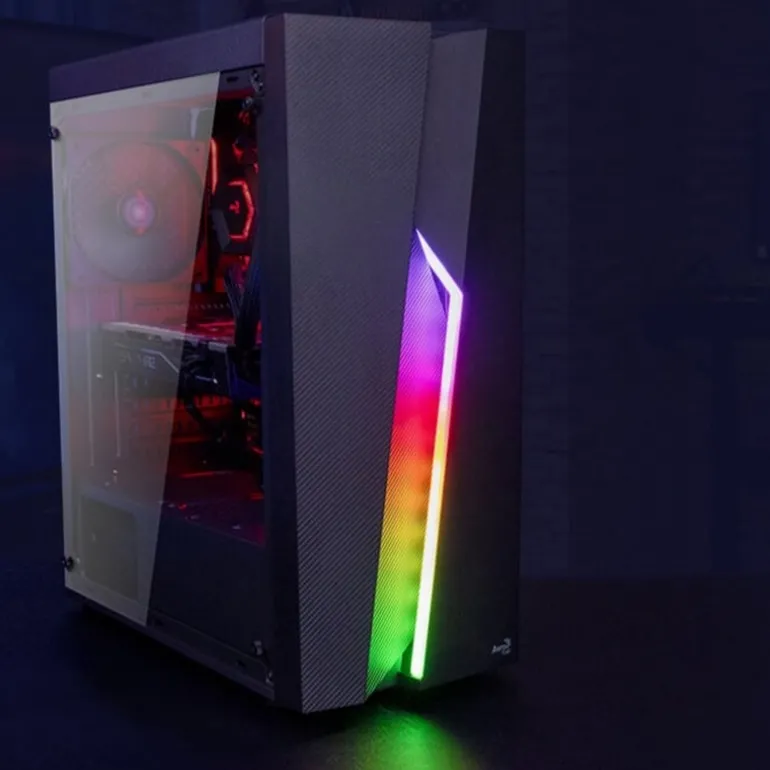Caja compacta de alto rendimiento con franja LED RGB de diseño Lightning Bolt en el panel frontal. Da vida a tu carcasa con 13 modos de iluminación: 6 flujos RGB y 7 modos de color estático. El interruptor de control LED convenientemente ubicado le permite ajustar sus efectos de iluminación para adaptarse a su estilo y estado de ánimo únicos. Esta caja está equipada con un panel lateral acrílico para mostrar el interior total de tu caja y un panel frontal de estilo fibram de carbono para conseguir un look futurista perfecto para tu setup.