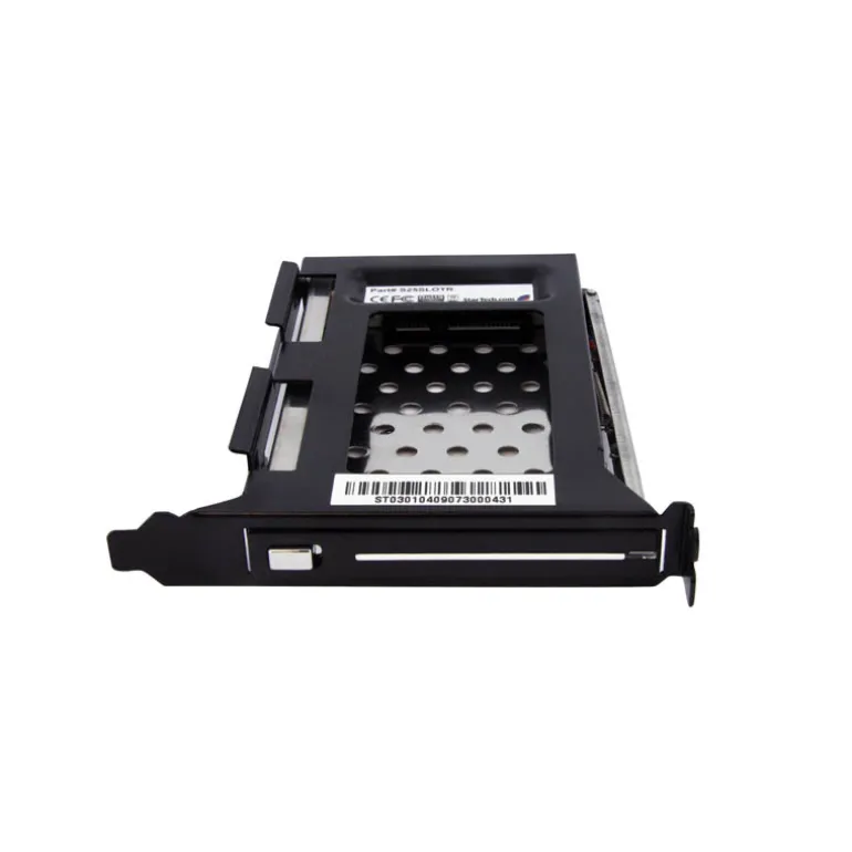 El estante para unidades de disco duro sin bandeja, modelo S25SLOTR, se puede instalar en una ranura de tarjeta de expansión PCI (perfil completo) disponible, lo cual permite el fácil acceso a una unidad de disco duro SATA o SSD de 2,5″ desde el panel trasero de una caja de ordenador.