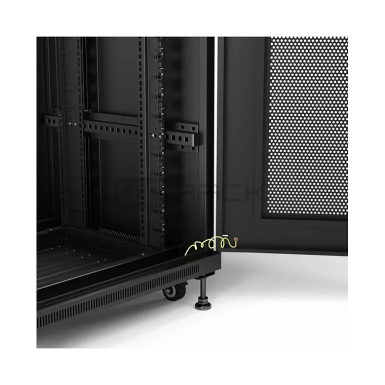 La capacidad de carga de hasta 800 kg permite alojar equipos pesados con facilidad, mientras que las patas de nivelación y las ruedas (incluyendo frenos en dos de ellas) facilitan la movilidad y estabilidad del armario. Además, la carcasa está diseñada para albergar ventiladores de 120 mm o kits de ventilación especializados en la parte superior, mejorando la gestión térmica y asegurando un funcionamiento óptimo del equipo.