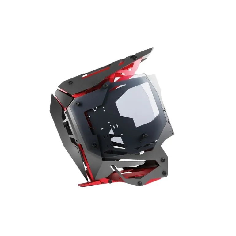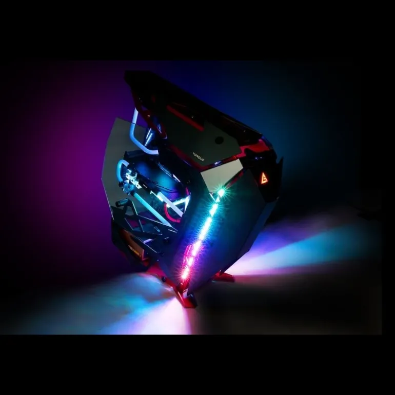La caja Open Frame permite increíbles opciones de rango de construcción incluyendo la instalación de una amplia gama de componentes de refrigeración por agua, como radiadores duales de 360 mm, numerosas bombas y más, mientras que el exclusivo diseño inclinado proporciona una orientación de 45 grados en la placa base para una apariencia futurista .