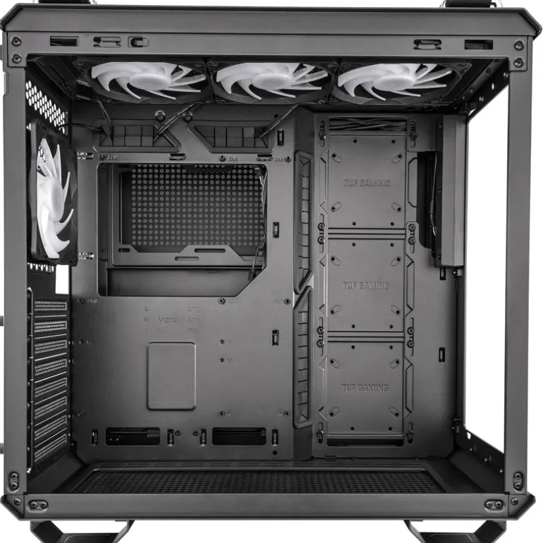 El TUF Gaming GT502 PLUS continúa sus optimizaciones para los constructores con paneles laterales que se pueden quitar simplemente presionando un botón oculto en la parte trasera del chasis.