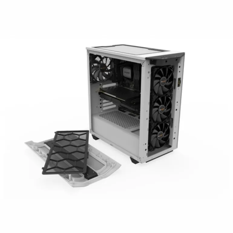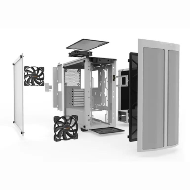 Tres ventiladores Pure Wings 2 preinstalados con flujo de aire optimizado garantizan una refrigeración y un flujo de aire perfectos. A pesar del diseño compacto de la caja, los ventiladores de la parte delantera, superior y trasera son modelos de 140 mm, lo que resulta en un funcionamiento muy silencioso. Se pueden instalar adicionalmente hasta dos ventiladores de 140 mm.