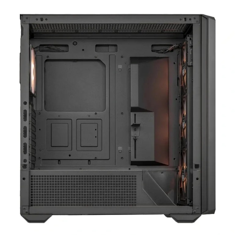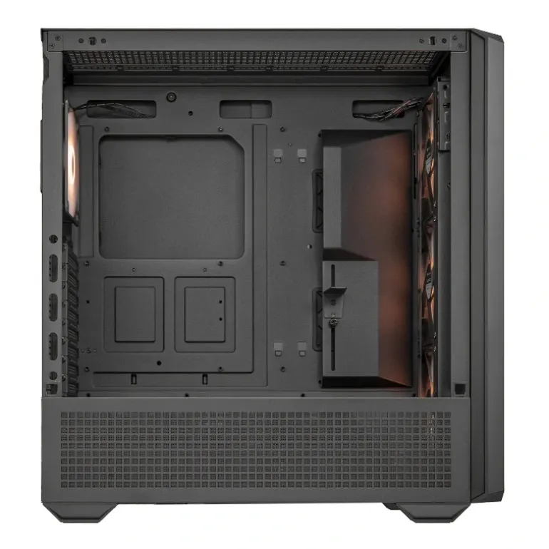 Despídete de los equipos calientes: la MX600 RGB está protegida contra el ascenso de las temperaturas, con ventilación omnidireccional completa que garantiza el máximo flujo de aire. (Las perforaciones cuadradas aumentan el flujo de aire en un 27% en comparación con los diseños circulares, ya que la superficie de un cuadrado es mayor que la de un círculo de diámetro equivalente).Dos estructuras angulares integradas, una en la base del panel frontal y otra en el lateral, orientan las corrientes de aire directamente hacia la CPU y la tarjeta gráfica con precisión láser, refrigerando los componentes más vitales donde más lo necesitan. Además, la cabina de la fuente de alimentación cuenta con una cubierta lateral ventilada para optimizar la entrada de aire, a la vez por su altura de 110 mm mejora el espacio libre para una circulación eficiente del aire.