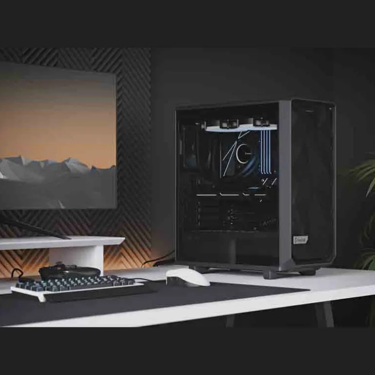 Meshify 2 Compact es una caja de alto rendimiento con una estética atrevida e inspirada en el sigilo. Su llamativo exterior cuenta con vidrio templado al ras sin tornillos, un panel superior completamente extraíble que otorga un excelente acceso al interior y un puerto USB 3.1 tipo C frontal.