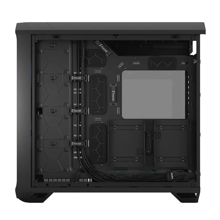 El interior se ha optimizado completamente para un flujo de aire sin obstrucciones. La fuente de alimentación se encuentra en la parte superior de la carcasa, en un conducto de fuente de alimentación aerodinámico. Los guiados y soportes cuidadosamente diseñados facilitan una gestión de cables ordenada, lo que beneficia tanto a la estética como al flujo de aire dirigido. Los dispositivos de almacenamiento, como SSD y HDD, se montan en la parte trasera de la bandeja de la placa base, contribuyendo también a un interior ordenado.