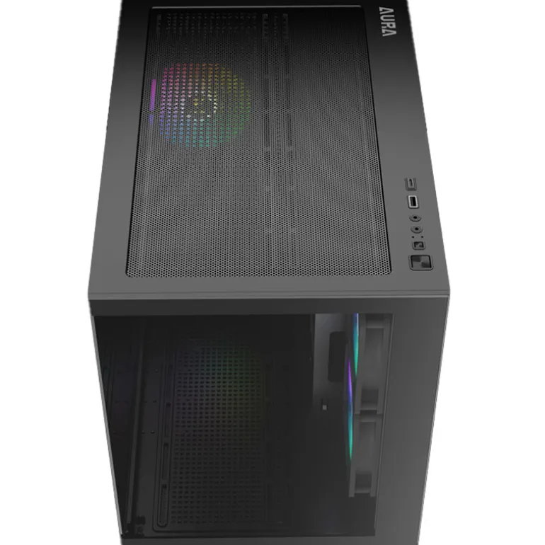 La serie AURA GC10M, disponible en blanco y negro, destaca como una microtorre asequible, caja de doble cámara con un diseño panorámico. La caja viene equipada con tres ventiladores ARGB integrados, compatibilidad interna mejorada y paneles frontales y laterales de cristal templado, lo que le permite mostrar el atractivo estético de su estructura.