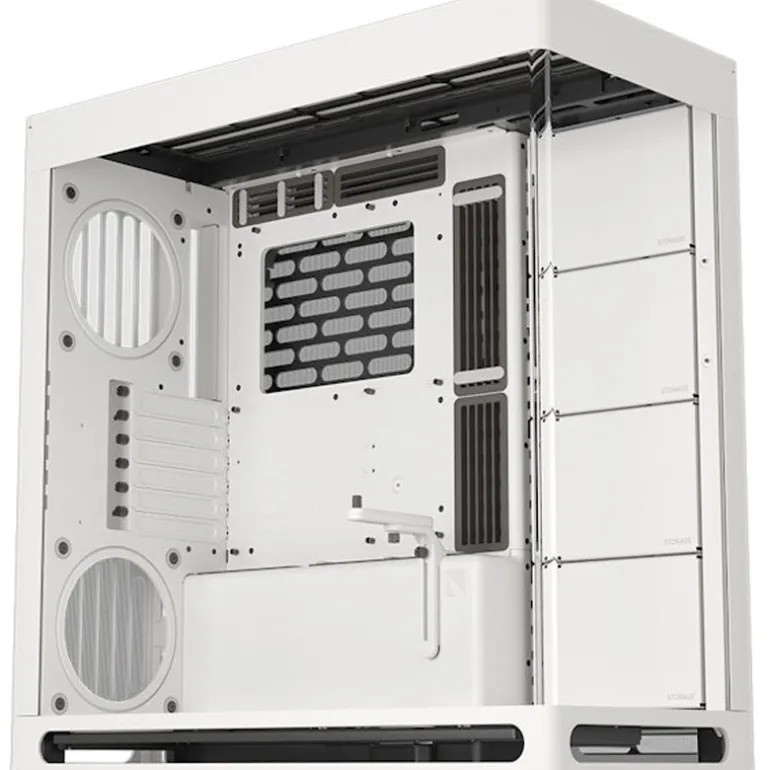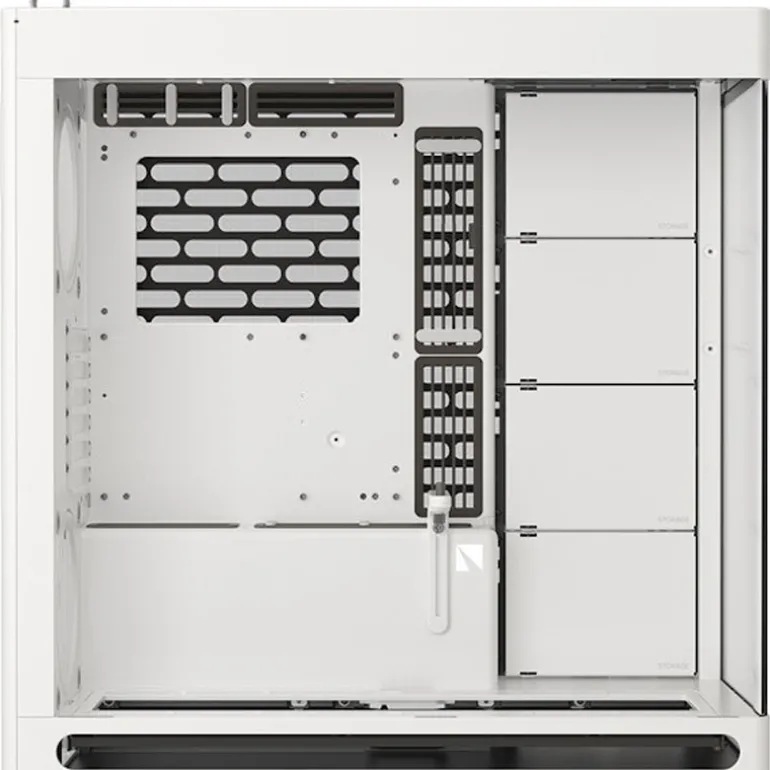 El espacio personalizable acomoda una combinación de almacenamiento, ventiladores, radiadores y pantallas portátiles (soporte de montaje VESA incluido)