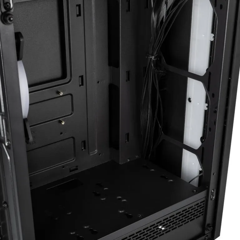 El interior es completamente negro, con una cubierta de fuente de alimentación que solo se suma a la apariencia elegante y discreta. Detrás de la cubierta, es donde los usuarios encuentran espacio para un par de discos duros de 3.5 «, utilizando un sistema de ‘soltar y bloquear’ para proteger. Alternativamente, los SSD de 2.5» se pueden instalar aquí o directamente en encima de la cubierta de la fuente de alimentación. La bandeja de la placa base y la cubierta de la fuente de alimentación ofrecen varias aberturas para optimizar la gestión del cable, con espacio para cable de hasta 30 mm. Debajo de la carcasa, hay un filtro de polvo extraíble adecuado para una fuente de alimentación ATX de hasta 180 mm.