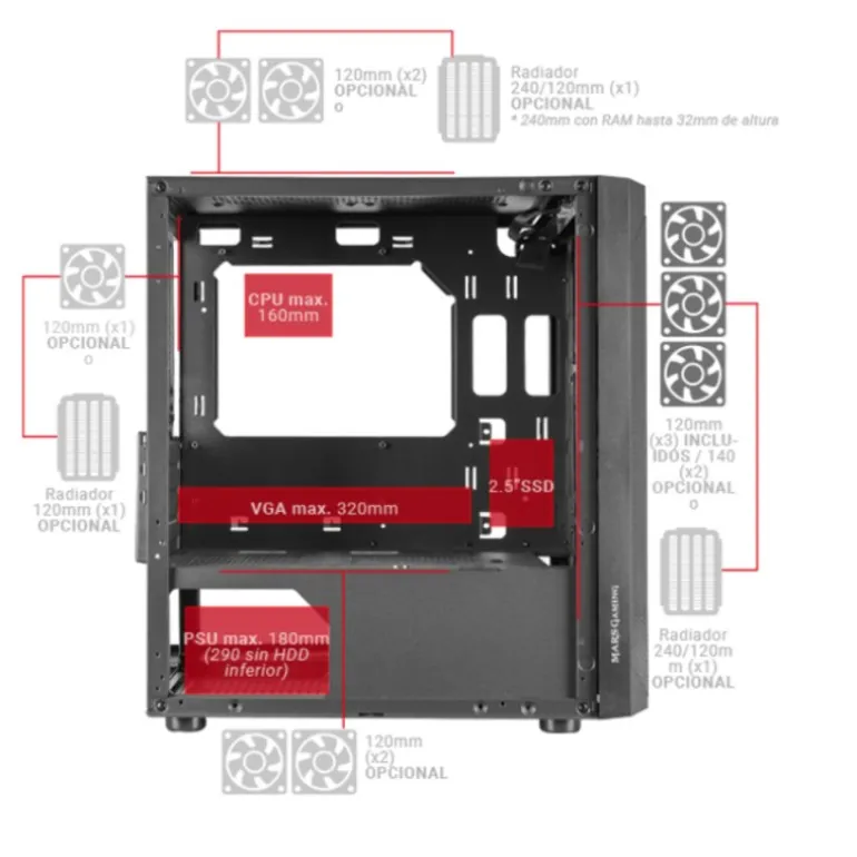 - Soporte refrigeración líquida: 240mm, 120mm frontal / 240mm (con memorias RAM hasta 32mm de alto) o 120mm superior / 120mm trasero