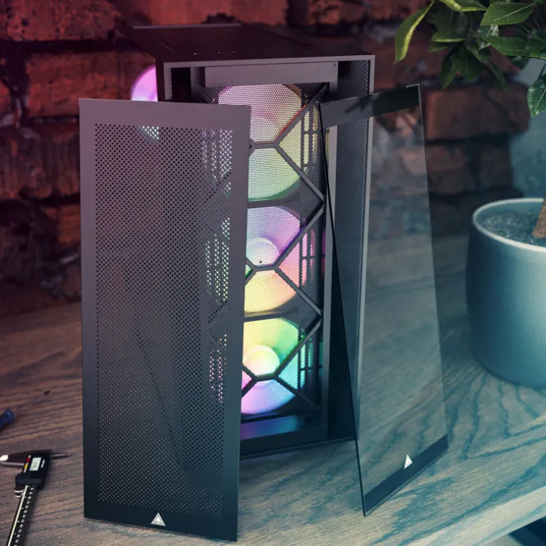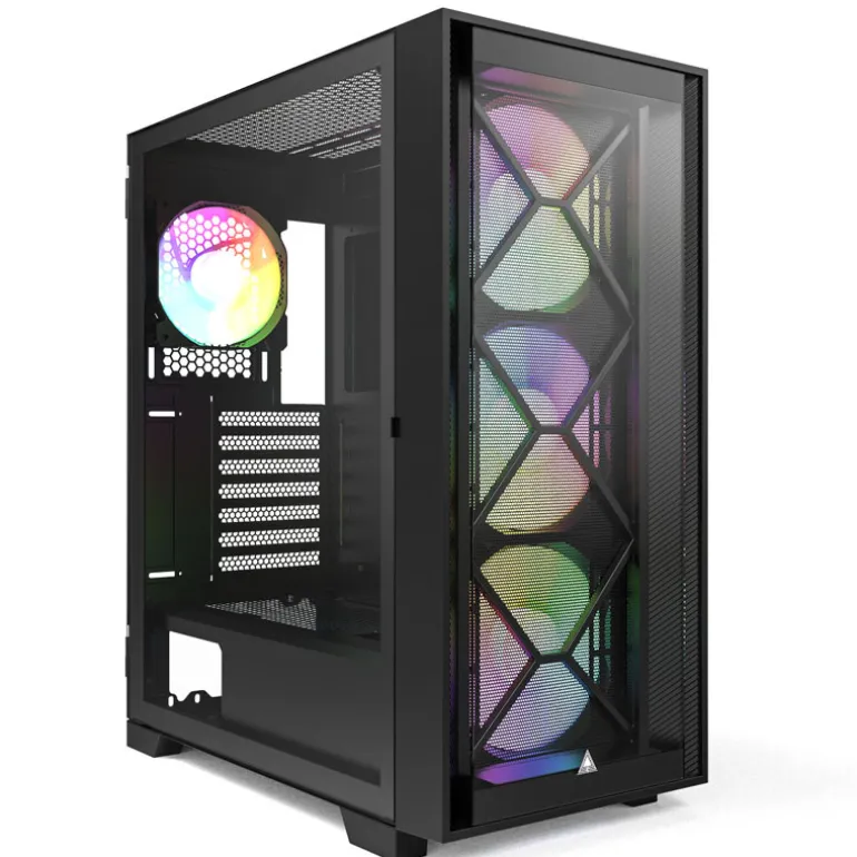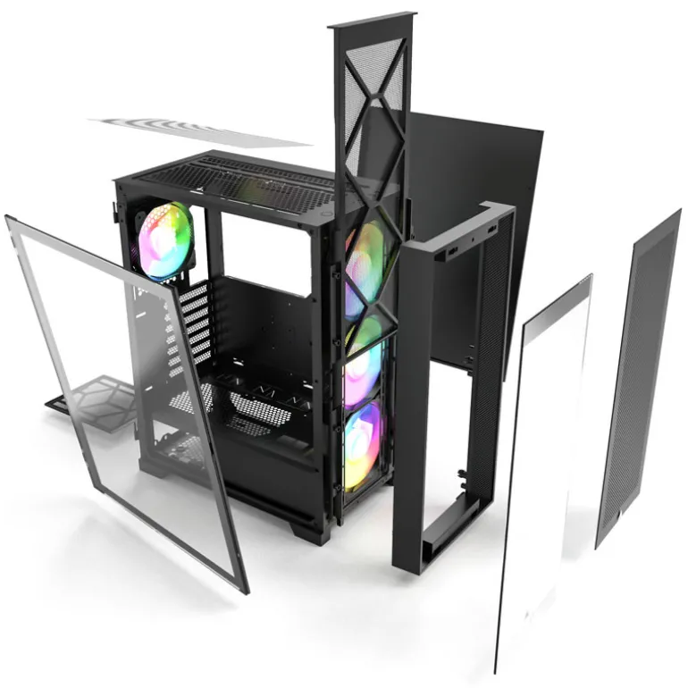- Material: acero (chasis), vidrio templado (panel lateral izquierdo, frente), malla (insertos)
