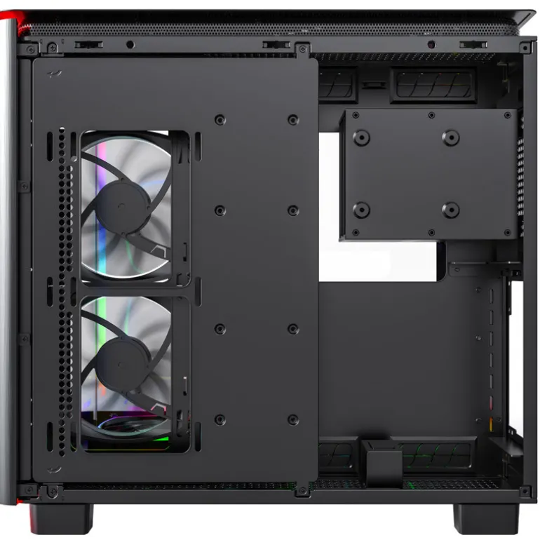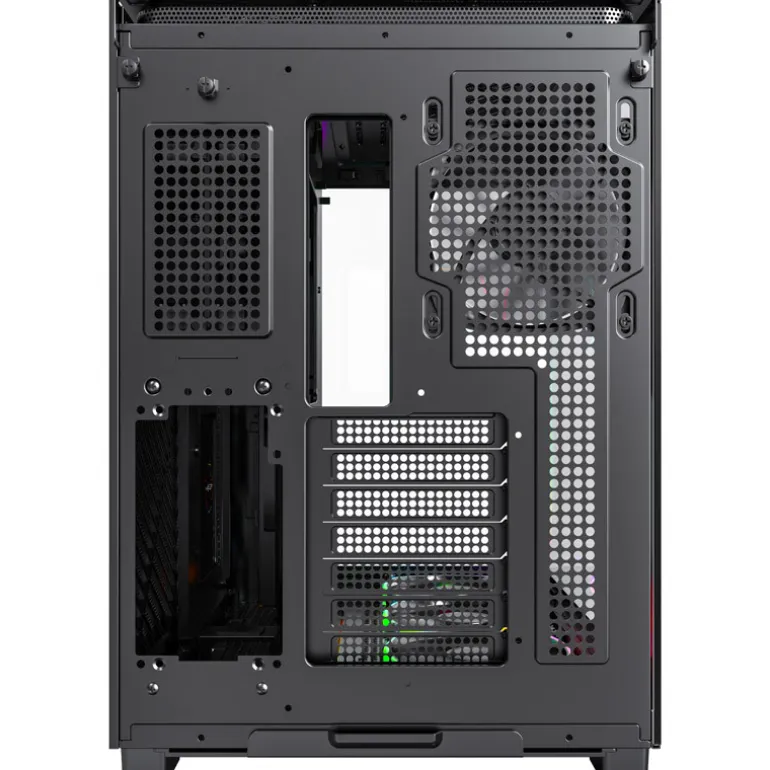 La doble cámara de KING 95 está diseñada para alojar 8 discos duros, fuentes de alimentación duales y tarjetas gráficas insignia 4090. Ofrece más de 35 mm de espacio para la gestión de cables, optimizando la refrigeración y brindando un sólido soporte para hardware.