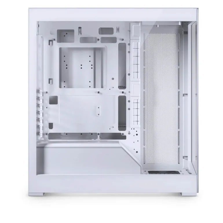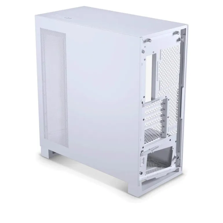 Se ha aumentado la anchura del chasis para admitir GPU más anchas y cables 12VHPWR. El soporte de GPU soporta y sujeta la GPU de forma segura al chasis y a la placa base. Ventilador de GPU dedicado para proporcionar flujo de aire directo a la GPU desde la parte inferior. Cubierta de la fuente de alimentación extraíble para facilitar el acceso a los cables de alimentación.