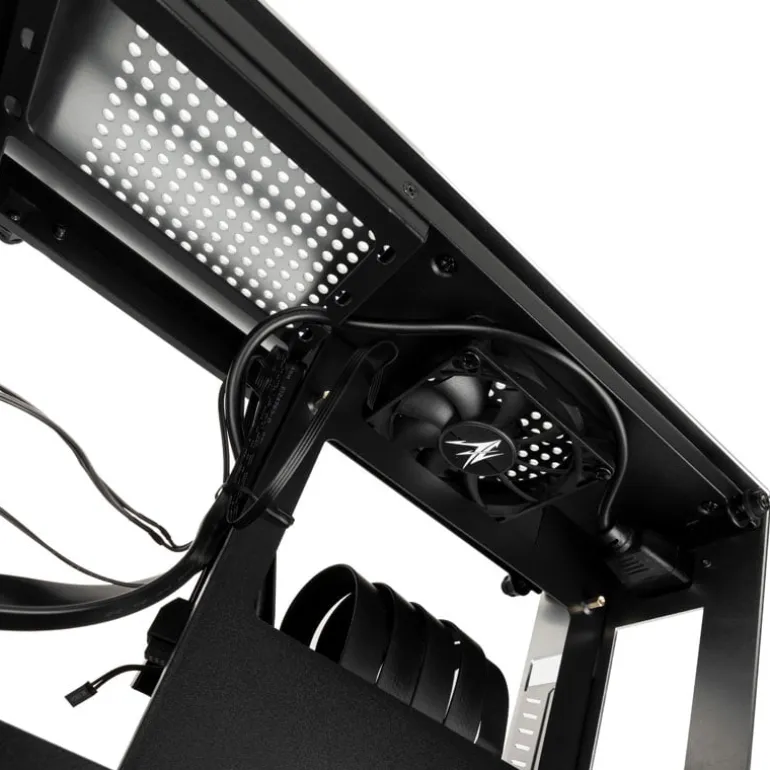 Además de ahorrar espacio, el concepto de dos cámaras separadas también tiene ventajas para la refrigeración de los componentes. Un ventilador de 80 mm preinstalado en la tapa garantiza el flujo de aire en la caja. Para la fuente de alimentación, la Zalman M2 Mini utiliza una fuente de alimentación SFX o SFX-L. Hay un total de dos ranuras de montaje de 2,5 pulgadas en la base para soportes de datos.