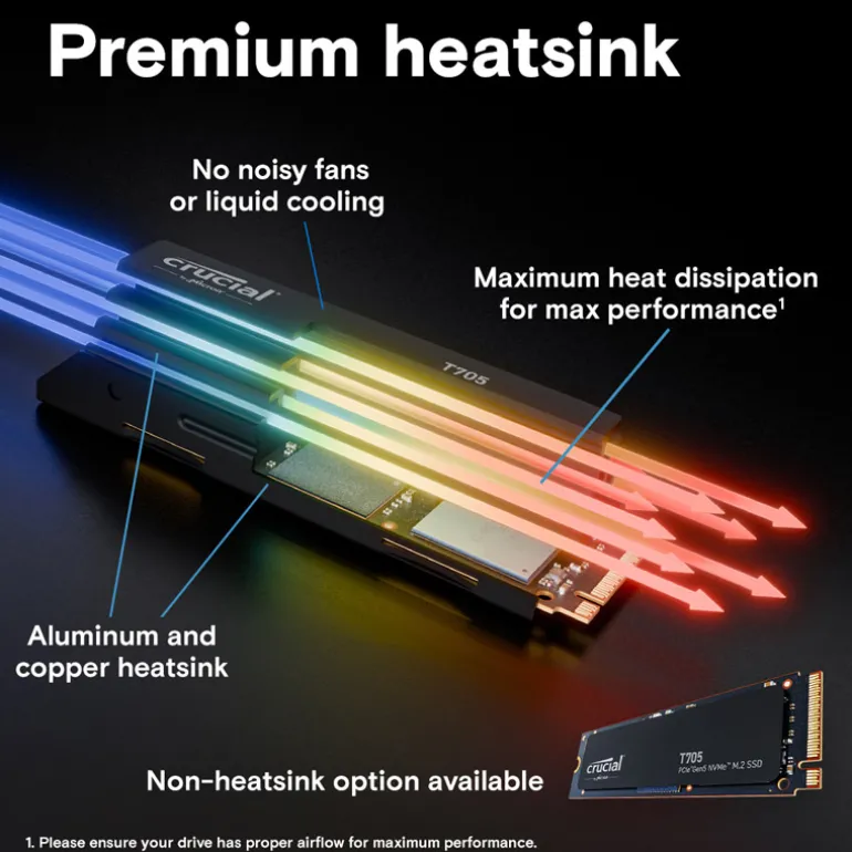 Agárrate fuerte: la SSD NVMe® Crucial® T705 Gen5 está llevando el rendimiento de Gen5 al siguiente nivel. Alimenta tus juegos, crea a la velocidad de las ideas y potencia las aplicaciones de IA con facilidad con esta obra maestra Gen5 totalmente optimizada que funciona con el disipador térmico de tu placa base.
