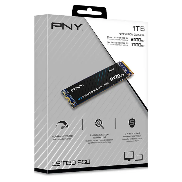 El SSD PNY CS1030 M.2 NVMe es una excelente opción para una actualización de NVMe desde una unidad de estado sólido (SSD) basada en SATA o un disco duro tradicional en una computadora de escritorio o portátil habilitada para NVMe. La unidad CS1030 está diseñada para ser una actualización del almacenamiento convencional basado en SATA para aprovechar el alto ancho de banda de la interfaz NVMe para ayudar a lograr tiempos de arranque más rápidos, lanzamientos de aplicaciones más rápidos y un mejor rendimiento general del sistema. Haga más en menos tiempo con NVMe; arranque, apague y cargue aplicaciones hasta 4 veces más rápido que con SSD basados en SATA. Sin piezas móviles, la SSD PNY CS1030 M.2 NVMe es muy duradera, tiene menos probabilidades de fallar y admite una garantía limitada de 5 años o TBW.