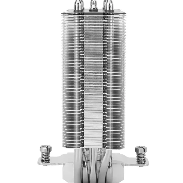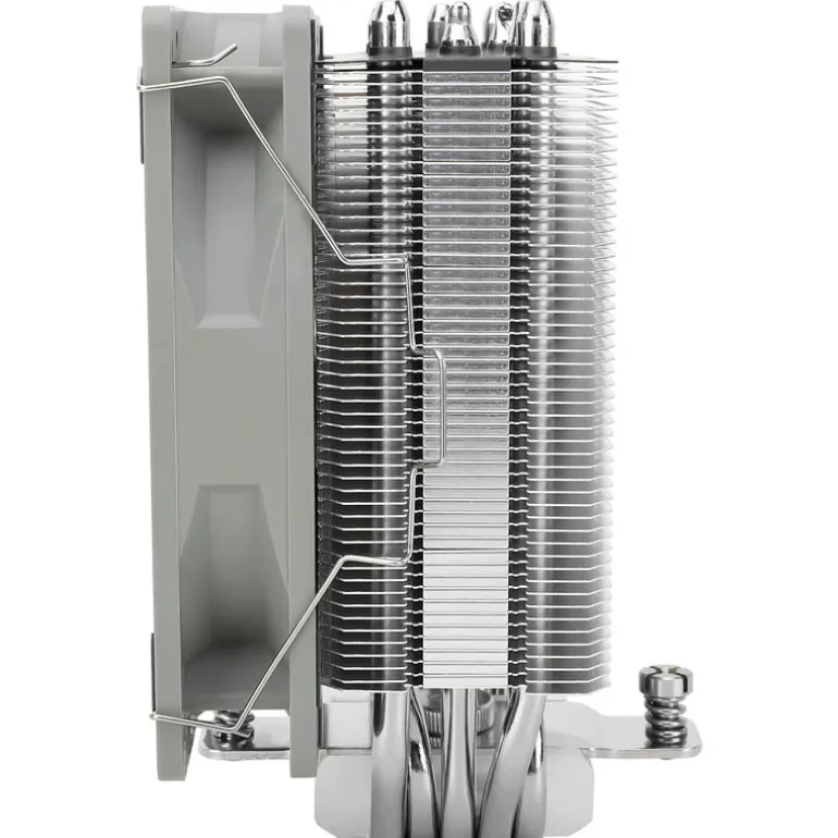 El disipador utiliza cinco tubos de calor de 6 mm para asegurar una transferencia de calor óptima desde el procesador hacia el radiador. Estos tubos están diseñados para maximizar la eficiencia térmica y mejorar la disipación del calor. Las aletas del radiador, con un espesor de 0,4 mm y un espaciamiento de 1,6 mm, están diseñadas para mejorar el flujo de aire y la eficiencia del enfriamiento.