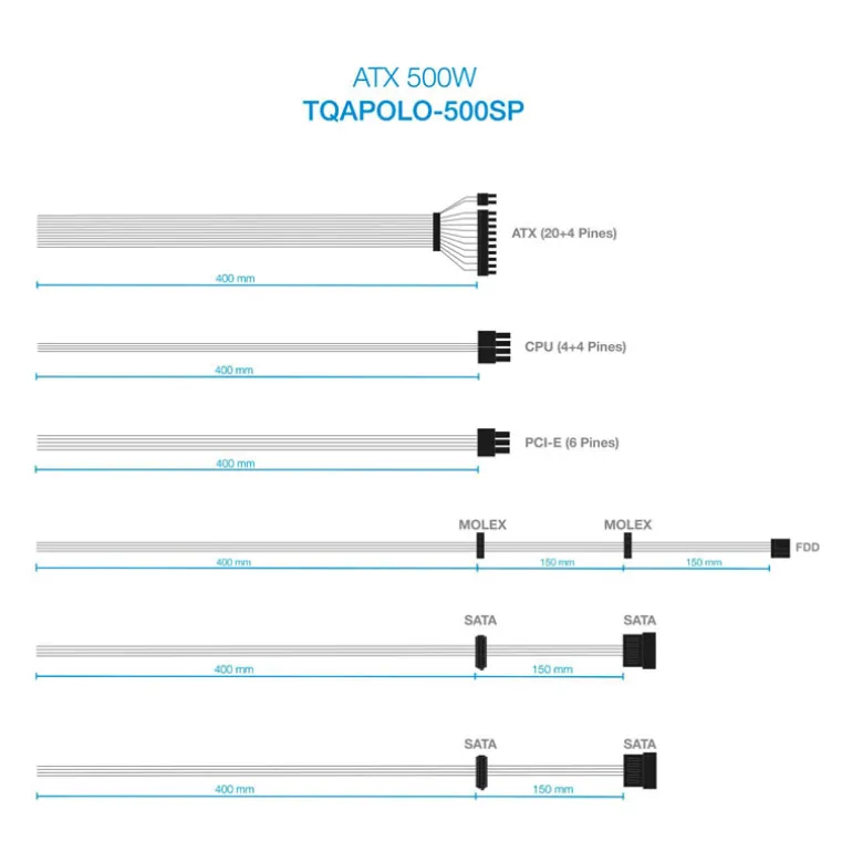 La fuente de alimentación TQAPOLO-500SP ofrece una potencia eficiente de 500W con una eficiencia superior al 78%, ideal para sistemas de computación que requieren un rendimiento estable. Equipada con PFC activo y múltiples protecciones de seguridad (OCP, OVP, UVP, SCP, OPP, OTP), asegura un suministro eléctrico confiable y seguro. Incluye un ventilador silencioso de 120 mm con control automático de velocidad para mantener un funcionamiento fresco y silencioso, complementado con un diseño compacto y conexiones versátiles que cumplen con las normativas CE y RoHS.