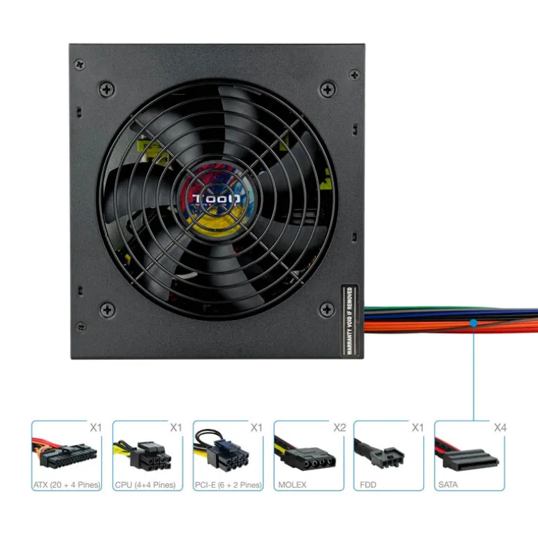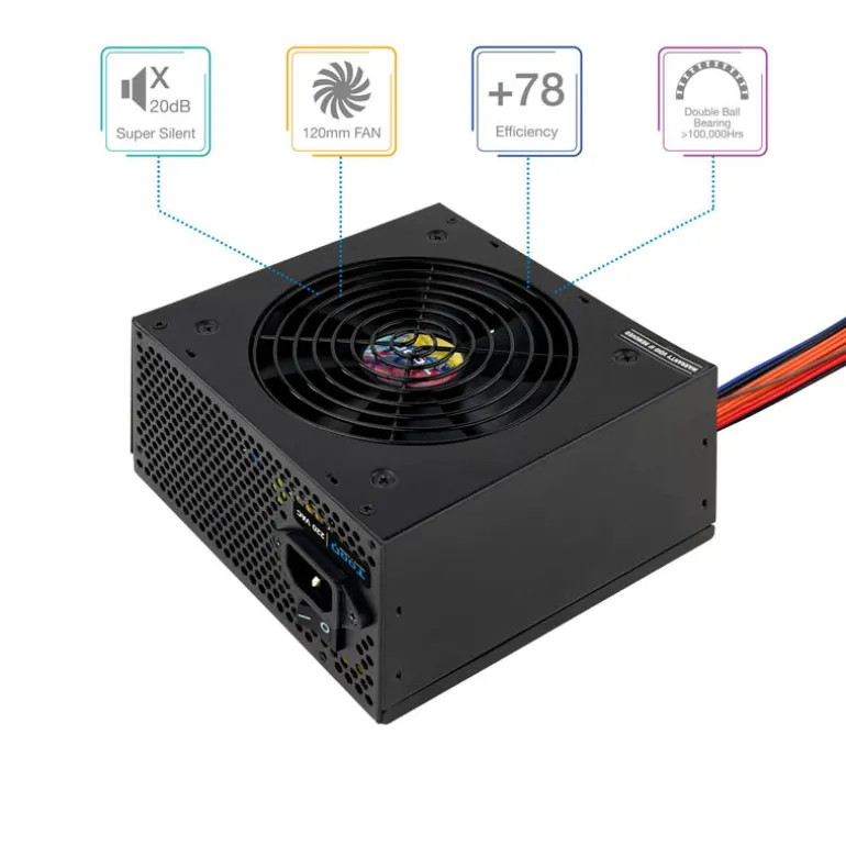 Los múltiples conectores disponibles, como el ATX (20+4 pines), CPU (4+4 pines), PCI-E (6+2 pines), Molex, SATA y FDD, aseguran la conectividad necesaria para todos los componentes de tu sistema. Todo ello en un elegante diseño negro, con medidas compactas que facilitan su integración en cualquier tipo de caja.