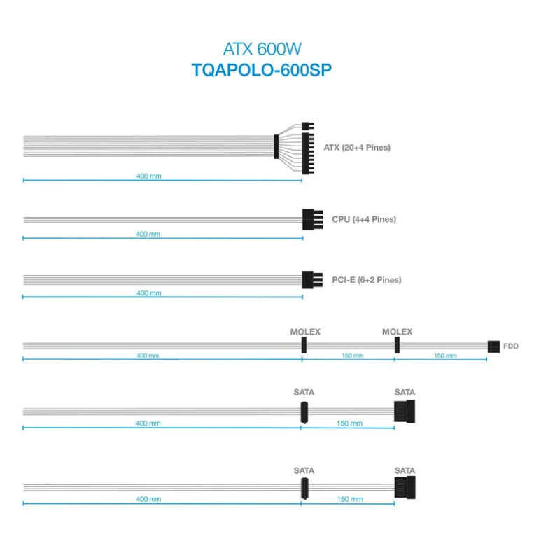 La fuente de alimentación TQAPOLO-600SP proporciona un rendimiento fiable y eficiente con una potencia de 600W y eficiencia superior al 78%. Equipada con PFC Activo y un ventilador silencioso de 140mm con control automático de velocidad, garantiza un funcionamiento estable y silencioso. Conectores versátiles, incluyendo ATX, CPU, PCI-E, Molex, SATA y FDD, aseguran la compatibilidad con diversos componentes, todo en un elegante diseño negro que se integra perfectamente en cualquier configuración de PC.
