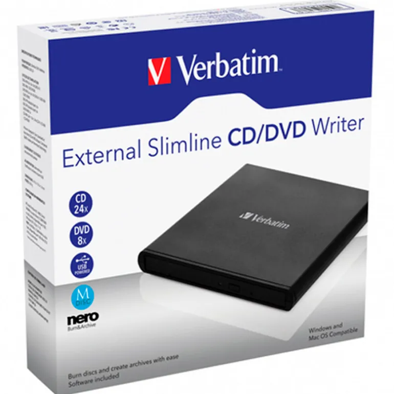 La Verbatim 53504 es una grabadora externa Slimline de CD/DVD por USB 2.0 en color negro, pensada para portátiles sin unidad óptica: compacta, práctica y alimentada directamente por USB para instalar software, reproducir discos o hacer copias de seguridad.