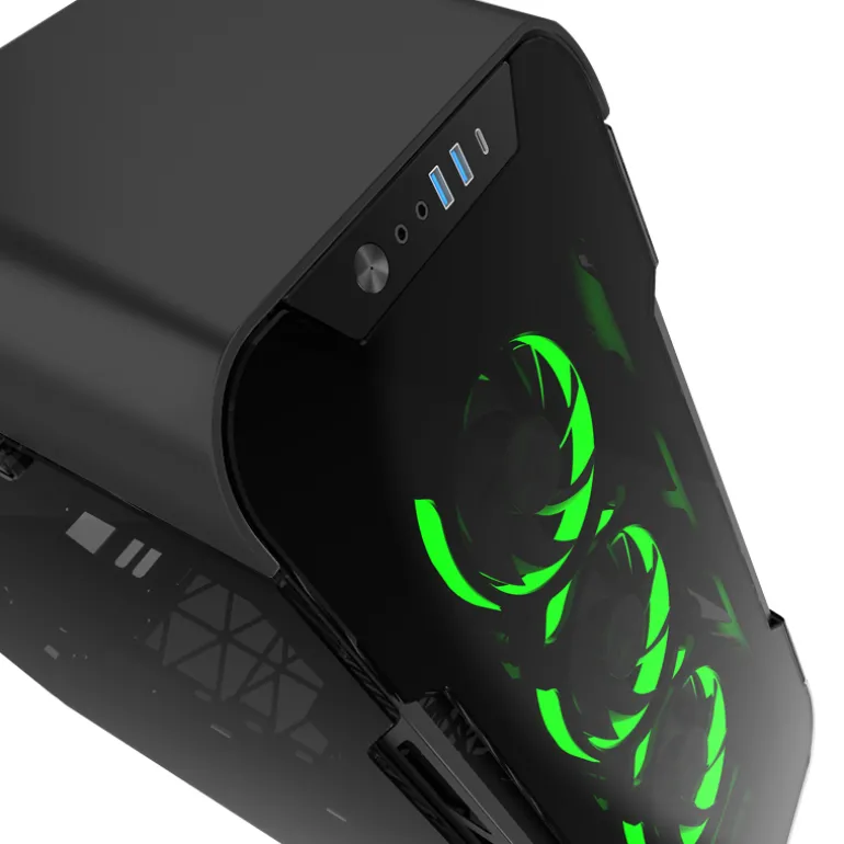 El TR03-G, NULL, basado en la forma triangular, llama la atención en cada configuración con su diseño inusual y futurista . Gracias a los dos grandes paneles laterales y al frente de vidrio templado, NULL, se puede destacar el potente hardware para juegos.