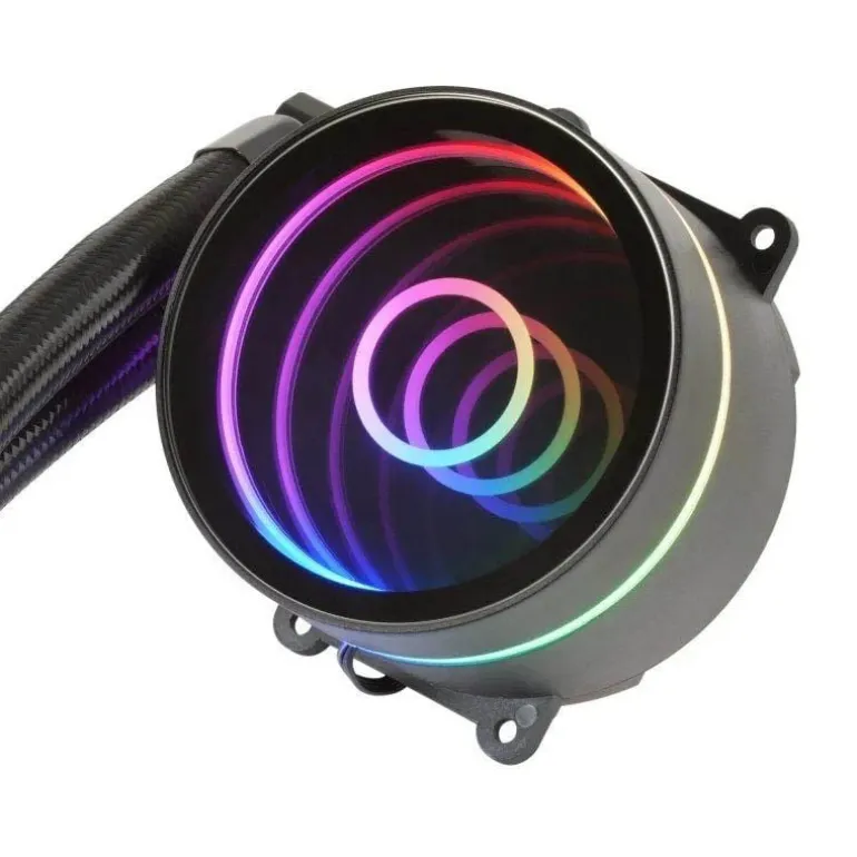 Espejo infinito FRGB y un rendimiento excepcional en sistemas de refrigeración líquida con una extraordinaria potencia de hasta 400W. Nueva bomba OPTI-CHAMBER, 2x ventiladores silencioso FDB FRGB, radiador de baja resistencia y compatibilidad universal.