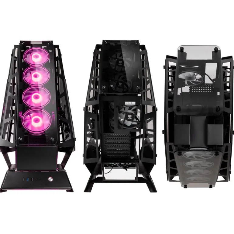 De vuelta con una venganza THICC, la edición UNIT de Big Chungus mejora varios aspectos de la carcasa original, incluida la actualización de los 5 ventiladores a versiones ARGB PWM de doble anillo. Sumado a eso, el soporte ahora es negro anodizado y viene preinstalado fuera de la caja. Mostrando su hardware desde todos los lados, el estuche es ideal para mostrar un circuito de enfriamiento de agua personalizado, y el hecho de que el estuche enorme brinda mucho espacio tampoco hace daño. Los materiales utilizados son de primera clase: los dos lados, el frontal e incluso la tapa son de vidrio templado sutilmente tintado. La base con el panel de E / S está hecha de aluminio. El marco utiliza acero recubierto de polvo negro de 1,0 mm de espesor.