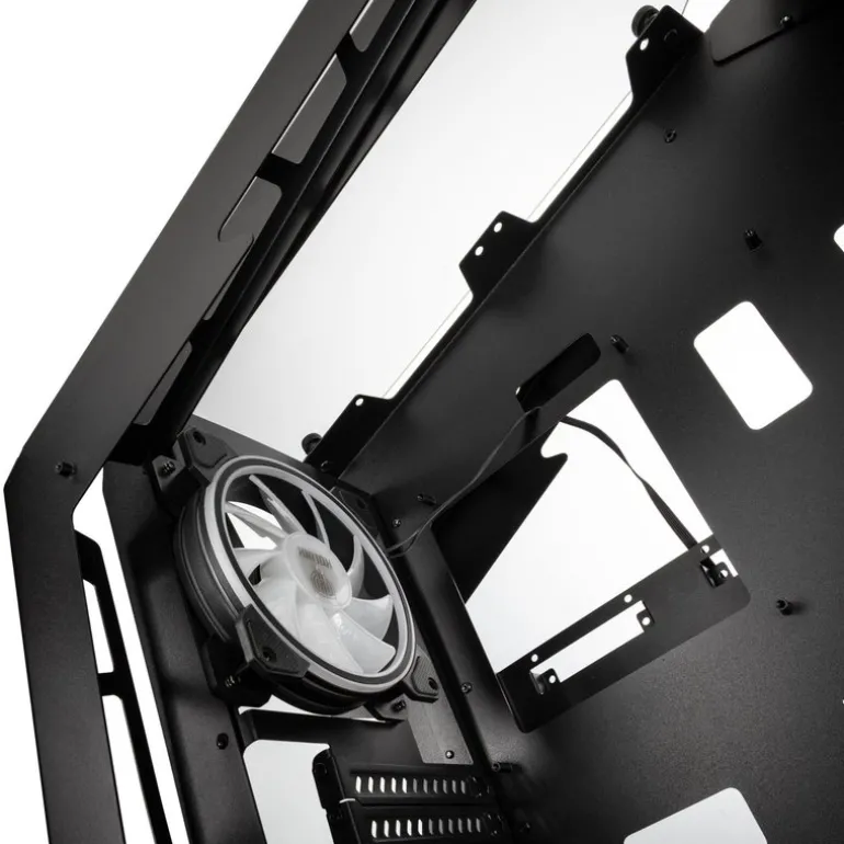 Cinco ventiladores PWM de 120 mm con LED RGB de doble anillo direccionables digitalmente ya están preinstalados. Cuatro de ellos adornan el frente y se pueden admirar a través del vidrio templado tintado. Otro ventilador PWM de 120 mm, también con LED RGB direccionables digitalmente, está integrado en la única ranura del ventilador en la parte trasera. Se pueden instalar dos ventiladores adicionales de 120 mm debajo de la tapa y tres ventiladores de 120 mm en la parte inferior. En consecuencia, los ventiladores también pueden ser reemplazados por radiadores. Se pueden montar radiadores de 360 â鈧€ón ATX (disponible por separado) está montada debajo de las tres ranuras del ventilador en la base y está oculta por la base. Puede tener hasta 220 milímetros de longitud.