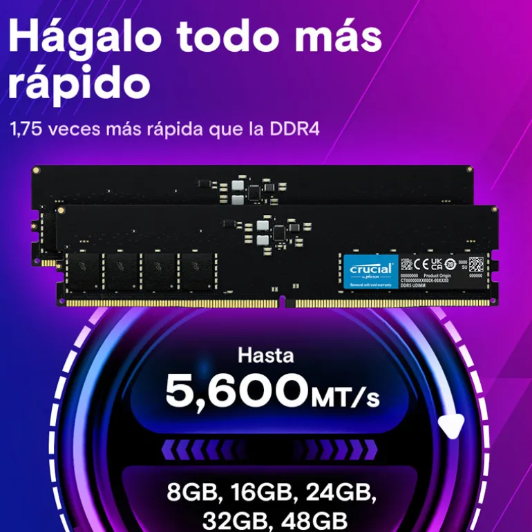 Las memorias Crucial DDR5 para ordenadores de sobremesa pueden potenciar el ordenador para alcanzar transferencias de datos un 50 % superiores que la DDR4 en su lanzamiento, proporcionando transferencia de archivos, descargas, tasas de actualización y tiempos de carga más rápidos, además de retardos mucho menores.