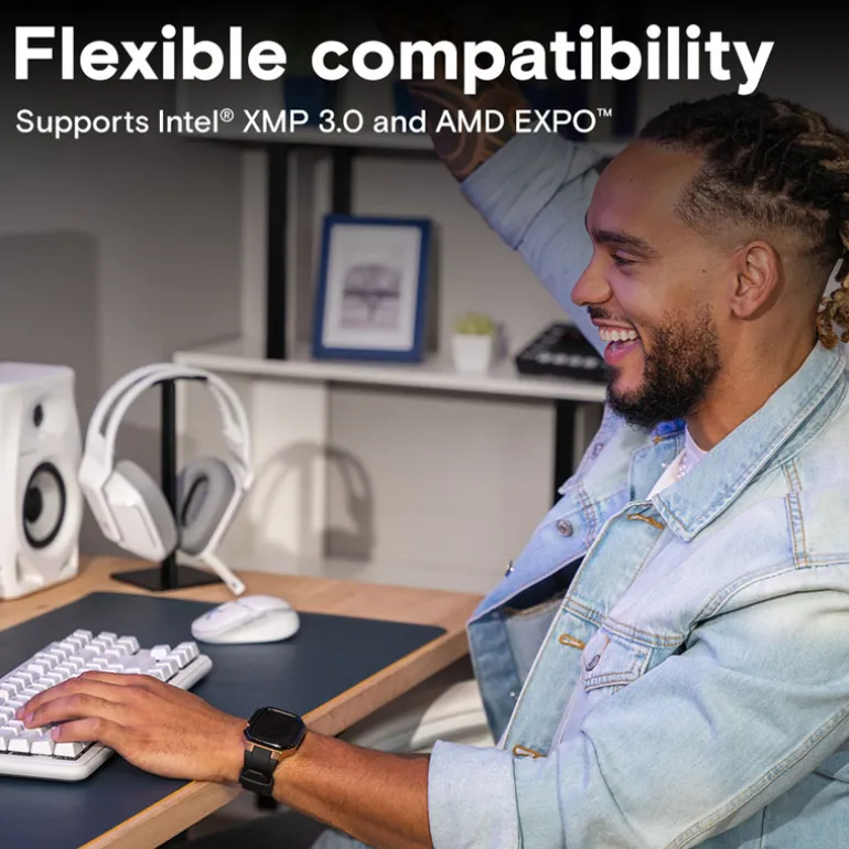 Crucial DDR5 ofrece velocidades un 50% más rápidas que DDR4 al lanzamiento, dotando a los usuarios de un rendimiento extremo desde el primer momento. Aún más impresionante, Crucial DDR5 está optimizado para mejorar el rendimiento y la multitarea, no solo durante las pruebas, sino en condiciones reales. Abrir más pestañas del navegador y cambiar entre aplicaciones ahora se siente más ágil que nunca.