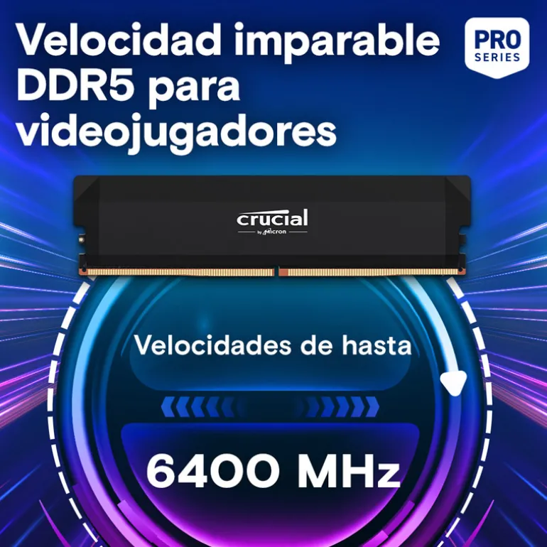 Impulse el rendimiento hasta un nuevo nivel con la velocidad de vértigo y el ancho de banda gigantesco de la memoria para videojuegos Crucial DDR5 Pro OC. Ponga a trabajar toda la potencia de la latencia baja para ir más rápido que nunca y ganar la siguiente partida en lugar de preocuparse por los cuellos de botella en el rendimiento.