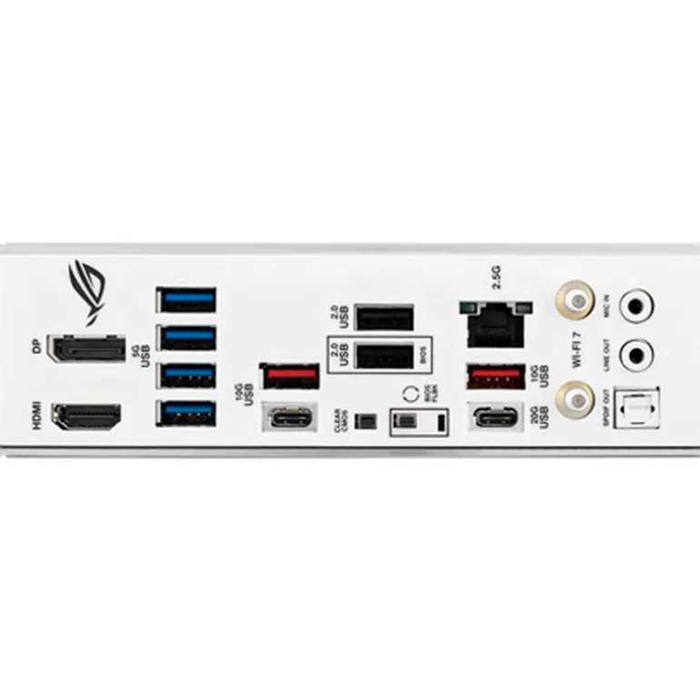 La ROG Strix B850-G presume de una deslumbrante placa de circuito circuito blanco para un estilo audaz y vanguardista que se adapta a casi cualquier configuración de PC. Combinado con disipadores metálicos, presenta un encanto audaz y impecable, mientras que un toque de RGB en el borde de I/O ofrece la elección entre una gracia discreta o un golpe vivo y luminoso.