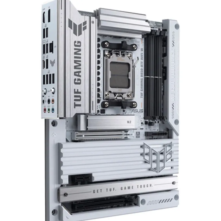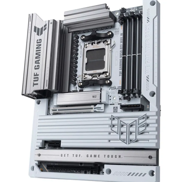 TUF GAMING B850-BTF WIFI W toma todos los elementos esenciales de los últimos procesadores AMD Ryzen鈩»BTF» significa «Back To (the) Future» (Regreso al futuro) para una nueva era para todos los jugadores de PC DIY; la avanzada serie BTF no sólo oculta todos sus conectores en la parte inferior de la placa base, sino que también suministra hasta 600 vatios para tarjetas gráficas BTF a través de una ranura de alta potencia para tarjetas gráficas, para una gestión limpia de los cables y un aspecto de construcción minimalista. Esta plataforma ofrece la potencia y la conectividad que exigen las aplicaciones informáticas avanzadas de IA.