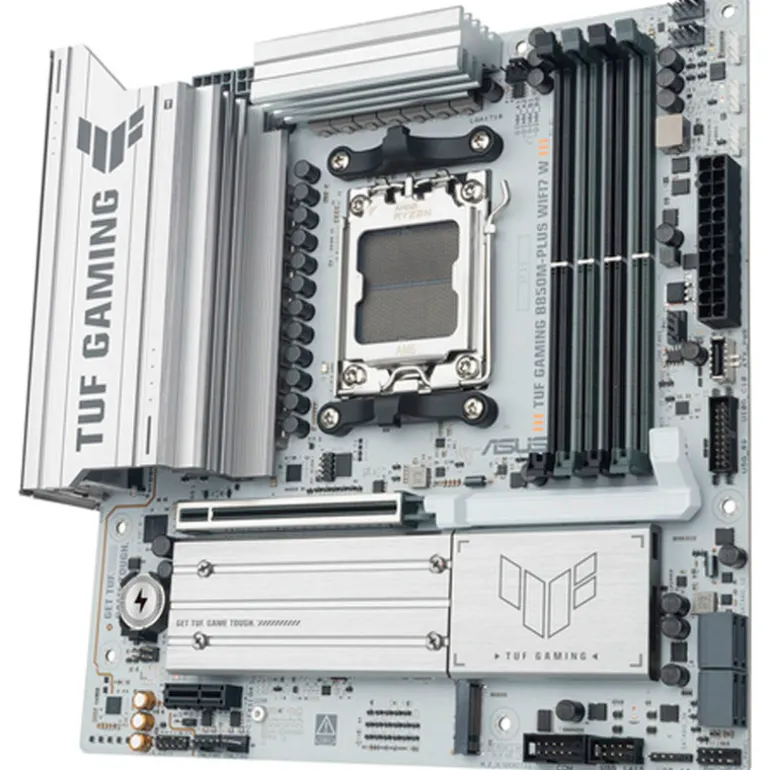 ASUS TUF GAMING B850M-PLUS WIFI7 W toma todos los elementos esenciales de los últimos procesadores AMD Ryzen鈩ñada con componentes de grado militar, una solución de alimentación mejorada y un completo sistema de refrigeración, esta placa base supera las expectativas con un rendimiento sólido como una roca y estable para juegos maratonianos. Las placas base TUF GAMING también se someten a rigurosas pruebas de resistencia para garantizar que pueden soportar condiciones en las que otras podrían fallar. Esta plataforma ofrece la potencia y la conectividad que exigen las aplicaciones informáticas avanzadas de IA.