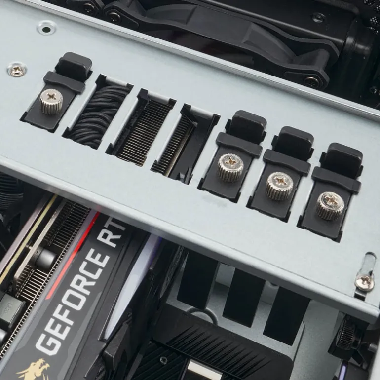 Para evitar cualquier daño imprevisto, bien a la placa base o a la tarjeta gráfica, se incluye un retenedor para tarjeta de expansión con agujeros de montaje para dispositivo de almacenamiento para evitar que las tarjetas gráficas se desprendan y a la vez maximizar el uso del espacio.