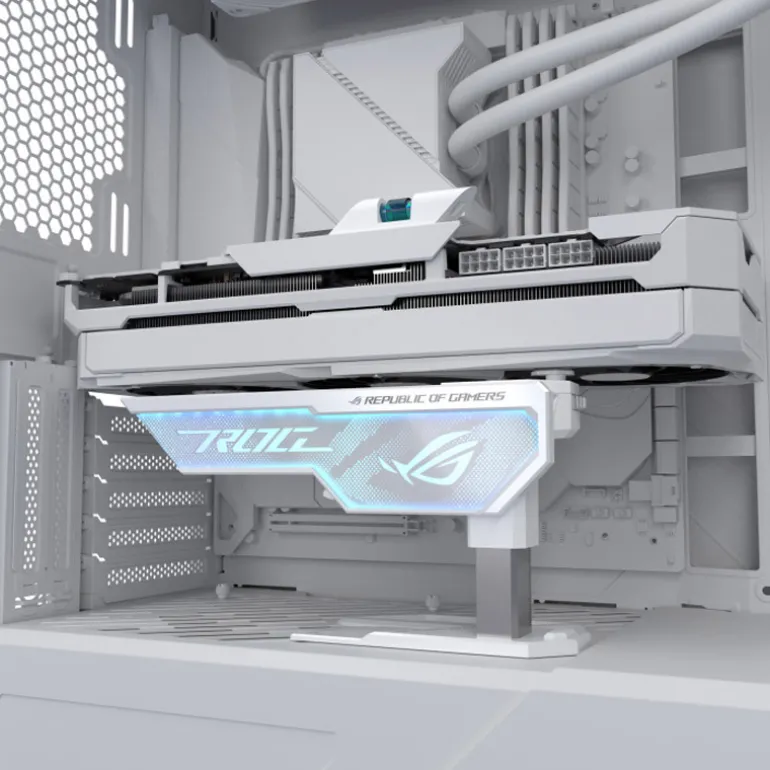 La ROG Herculx tiene la integridad estructural para soportar la carga de incluso la tarjeta gráfica más pesada. La instalación sin herramientas, el ajuste de precisión y la iluminación RGB personalizable se combinan en un diseño que ahorra espacio y se desliza perfectamente para proteger su inversión en potencia de GPU.