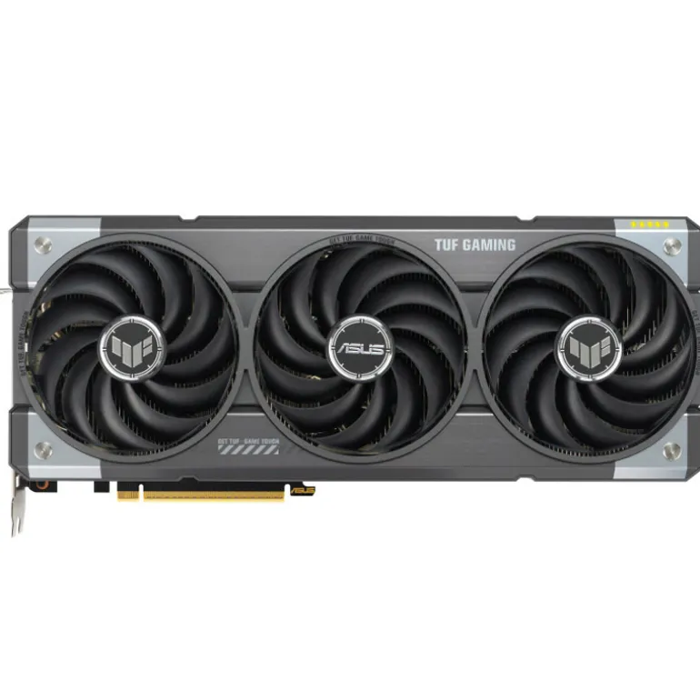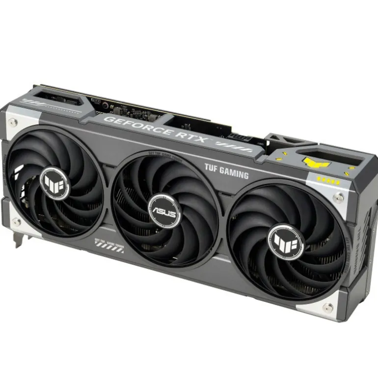 Los dos ventiladores exteriores giran en sentido contrario a las agujas del reloj para reducir la turbulencia y mejorar la dispersión del aire. Los tres ventiladores se detienen cuando las temperaturas de la GPU son inferiores a 50 °C, para un funcionamiento más silencioso durante las tareas ligeras. Se reinician por encima de los 55 °C, siguiendo una curva de velocidad que equilibra el rendimiento y la acústica.