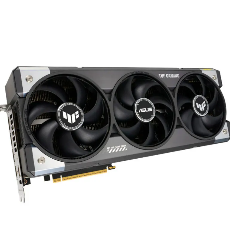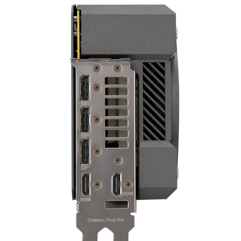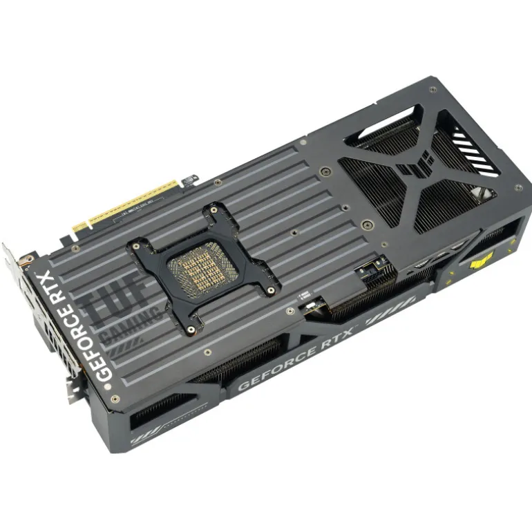 Los dos ventiladores exteriores giran en sentido contrario a las agujas del reloj para reducir la turbulencia y mejorar la dispersión del aire. Los tres ventiladores se detienen cuando las temperaturas de la GPU son inferiores a 50 °C, para un funcionamiento más silencioso durante las tareas ligeras. Se reinician por encima de los 55 °C, siguiendo una curva de velocidad que equilibra el rendimiento y la acústica.