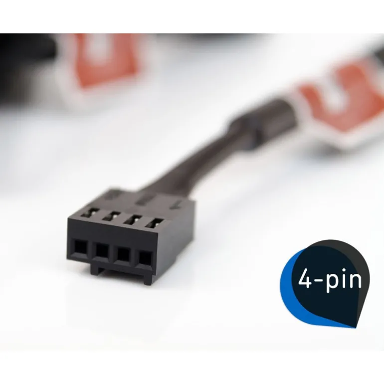 El cable primario corto de 20 cm del ventilador minimiza el desorden de cables en aplicaciones típicas, mientras que la extensión de 30 cm suministrada proporciona un alcance extendido cuando sea necesario. Ambos cables están completamente fundados y un cable en Y de 4 pines permite la conexión de un segundo ventilador al mismo cabezal de ventilador PWM para el control automático.
